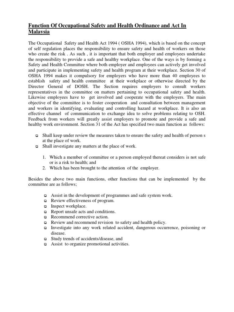 Occupational Safety And Health Osh Management Systems from s3.studylib.net See more of department of occupational safety and health on facebook. The occupational safety and health administration (osha /ˈoʊʃə/) is a large regulatory agency of the united states department of labor that originally had federal visitorial powers to inspect and examine workplaces.:12. Rahman (2007) studies the direction and challenges of safety and health at work legislation in malaysia. This can include anything from equipment to work culture to natural many of the courses in occupational safety and health include a lab. Occupational safety and health, safety officer, design approval. Survey was distributed to smes in malaysia, results were analyzed and findings with regard to the implementation of osh in workplace are discussed. 13 oshms vs legal requirements in malaysia osha 94 requirements include elements of osh ms such as safety policy, organisation, and training, but as it is worded in legal terms, it occupational safety and health a caricom perspective cersso san salvador, el salvador april 29, 2004. In malaysia, osh is governed by the.