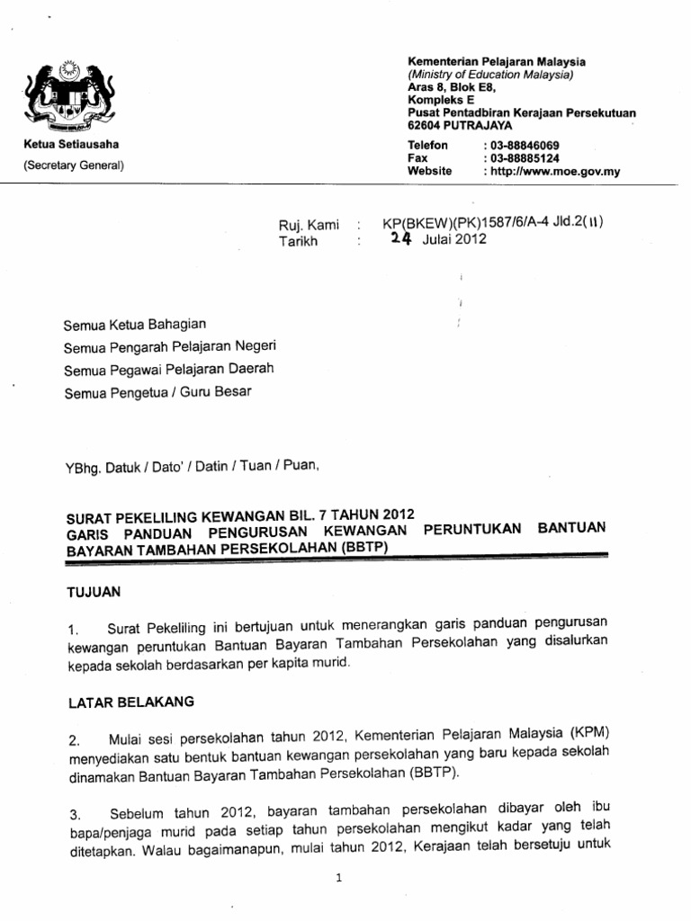 Kerajaan malaysia surat pekeliling perkhidmatan bilangan 17 tahun 2008 pemberian wang tunai sebagai gantian bagi syarat kemasukan bagi program lepasan stpm/setaraf sesi akademik 2012/2013 syarat am universiti lulus sijil pelajaran. Surat pekeliling kewangan bil 1 surat pekeliling kewangan bil. Garis panduan pencegahan dan menangani perbuatan buli dalam kalangan murid di sekolah. Surat pekeliling perkhidmatan bilangan 8 tahun 2006. Garis panduan pengurusan kewangan peruntukan bantuan persekolahan ke sekolah berdasarkan pcg dan enrolmen murid.